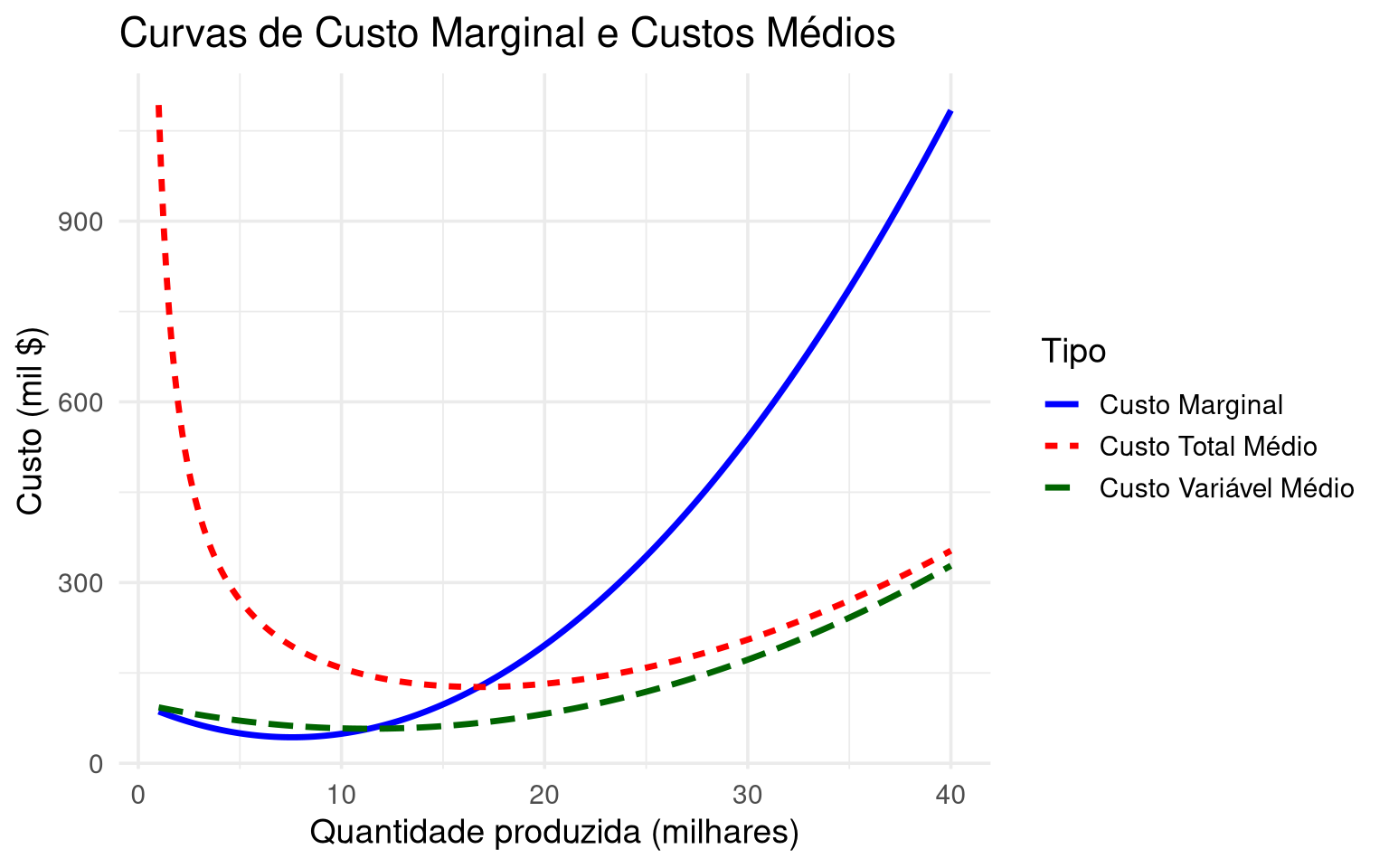 g) um gráfico mostrando que a curva de custo marginal intercepta as curvas de custo variável médio e custo total médio em seus respectivos pontos de mínimo.