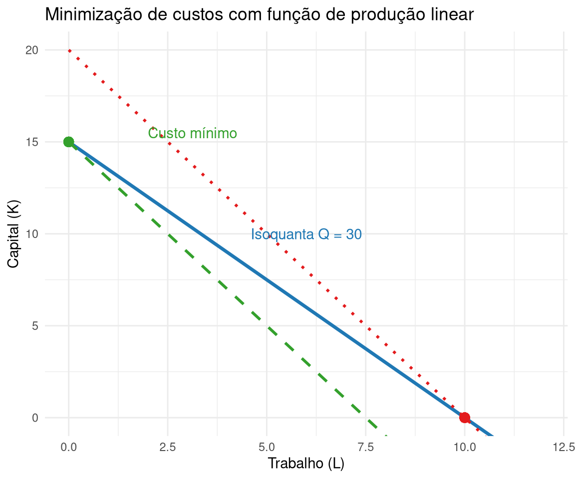 Uma firma deseja produzir uma quantidade \(\bar{Q} = 30\) unidades de produto com o menor custo possível. A função de produção da firma é linear: