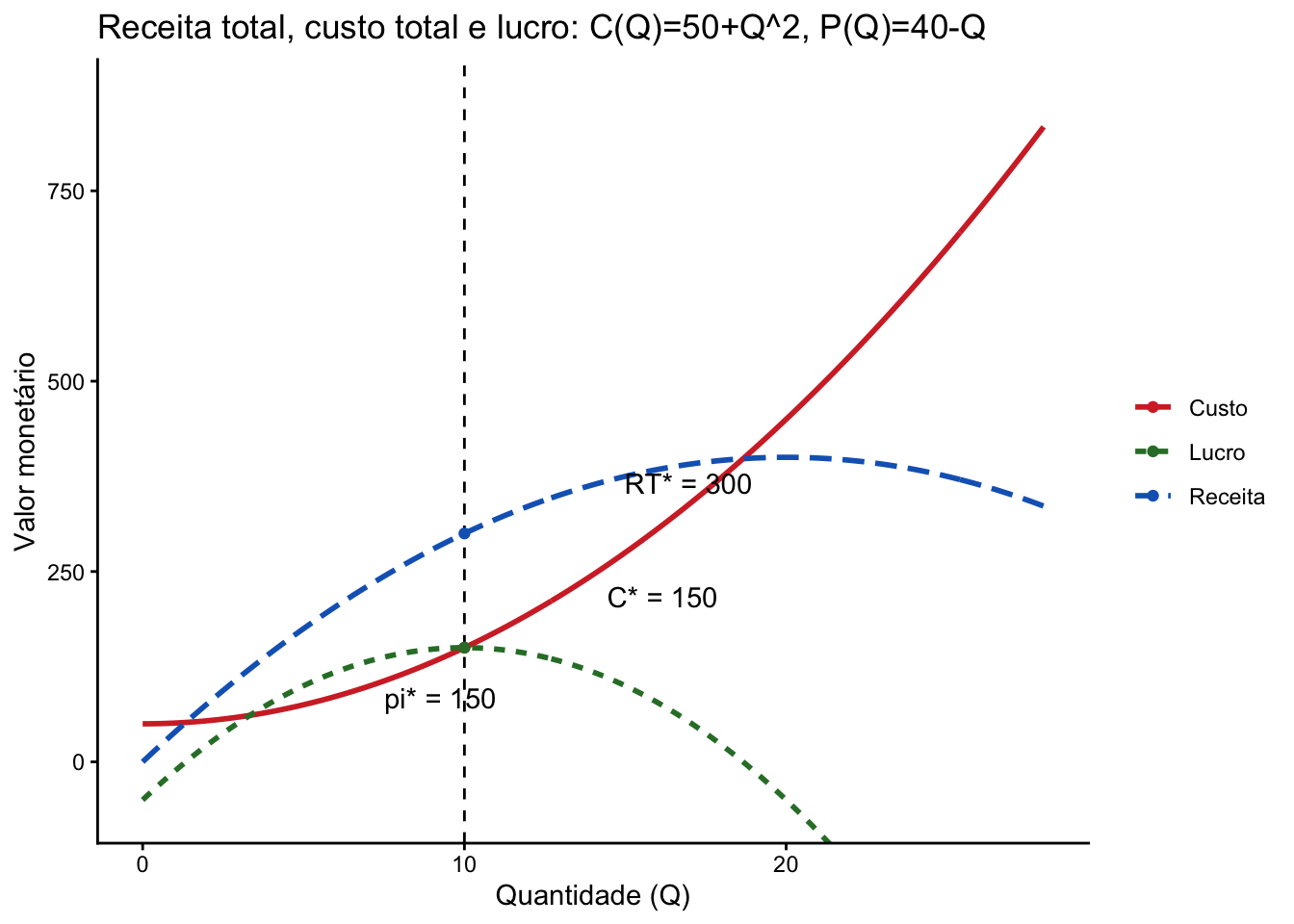 title = "Receita total, custo total e lucro: C(Q)=50+Q^2, P(Q)=40-Q",