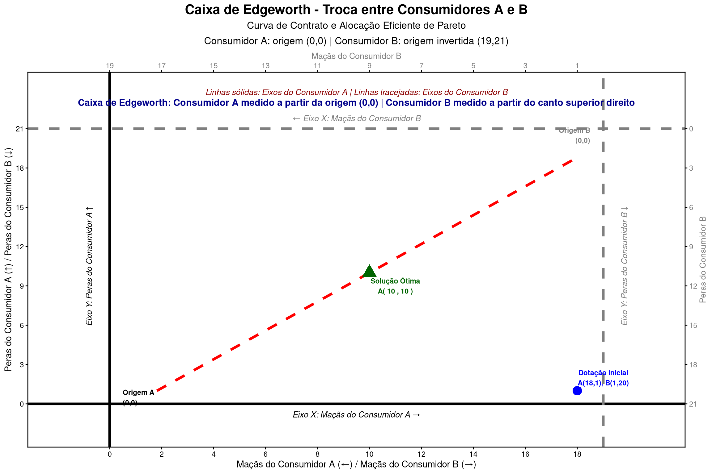 # 8. Visualização da Caixa de Edgeworthif (!is.null(curva_completa)) {# Criar gráfico da caixa de Edgeworth grafico_edgeworth <- ggplot2::ggplot() +# Curva de contrato ggplot2::geom_line(data = curva_completa, ggplot2::aes(x = q_m_A, y = q_p_A),color ="red", linewidth =1.5, linetype ="dashed" ) +# Dotação inicial ggplot2::geom_point(data =data.frame(x = dotal_A[1], y = dotal_A[2]), ggplot2::aes(x = x, y = y),color ="blue", size =5, shape =16 ) +# Solução ótima ggplot2::geom_point(data = solucao_otima, ggplot2::aes(x = q_m_A, y = q_p_A),color ="darkgreen", size =6, shape =17 ) +# Limites da caixa - Eixos do Consumidor A (origem) ggplot2::geom_vline(xintercept =0, linewidth =1.5, color ="black") + ggplot2::geom_hline(yintercept =0, linewidth =1.5, color ="black") +# Limites da caixa - Eixos do Consumidor B (invertido) ggplot2::geom_vline(xintercept = total[1], linewidth =1.5, color ="gray50", linetype ="dashed") + ggplot2::geom_hline(yintercept = total[2], linewidth =1.5, color ="gray50", linetype ="dashed") +# Anotações - Dotação inicial ggplot2::annotate("text", x = dotal_A[1] +1, y = dotal_A[2] +1,label ="Dotação Inicial\nA(18,1), B(1,20)",color ="blue", fontface ="bold", size =3 ) +# Anotações - Solução ótima ggplot2::annotate("text", x = solucao_otima$q_m_A +1, y = solucao_otima$q_p_A -1,label =paste("Solução Ótima\nA(", round(solucao_otima$q_m_A, 1), ",", round(solucao_otima$q_p_A, 1), ")"),color ="darkgreen", fontface ="bold", size =3 ) +# Anotações - Consumidor A (origem) ggplot2::annotate("text", x =0.5, y =0.5,label ="Origem A\n(0,0)",color ="black", fontface ="bold", size =3, hjust =0 ) + ggplot2::annotate("text", x = total[1]/2, y =-0.8,label ="Eixo X: Maçãs do Consumidor A →",color ="black", fontface ="italic", size =3.5, hjust =0.5 ) + ggplot2::annotate("text", x =-0.8, y = total[2]/2,label ="Eixo Y: Peras do Consumidor A ↑",color ="black", fontface ="italic", size =3.5, hjust =0.5, angle =90 ) +# Anotações - Consumidor B (canto superior direito) ggplot2::annotate("text", x = total[1] -0.5, y = total[2] -0.5,label ="Origem B\n(0,0)",color ="gray50", fontface ="bold", size =3, hjust =1 ) + ggplot2::annotate("text", x = total[1]/2, y = total[2] +0.8,label ="← Eixo X: Maçãs do Consumidor B",color ="gray50", fontface ="italic", size =3.5, hjust =0.5 ) + ggplot2::annotate("text", x = total[1] +0.8, y = total[2]/2,label ="Eixo Y: Peras do Consumidor B ↓",color ="gray50", fontface ="italic", size =3.5, hjust =0.5, angle =90 ) +# Anotações explicativas ggplot2::annotate("text", x = total[1]/2, y = total[2] +2.0,label ="Caixa de Edgeworth: Consumidor A medido a partir da origem (0,0) | Consumidor B medido a partir do canto superior direito",color ="darkblue", fontface ="bold", size =4, hjust =0.5 ) + ggplot2::annotate("text", x = total[1]/2, y = total[2] +2.8,label ="Linhas sólidas: Eixos do Consumidor A | Linhas tracejadas: Eixos do Consumidor B",color ="darkred", fontface ="italic", size =3.5, hjust =0.5 ) + ggplot2::labs(title ="Caixa de Edgeworth - Troca entre Consumidores A e B",subtitle ="Curva de Contrato e Alocação Eficiente de Pareto\nConsumidor A: origem (0,0) | Consumidor B: origem invertida (19,21)",x ="Maçãs do Consumidor A (←) / Maçãs do Consumidor B (→)",y ="Peras do Consumidor A (↑) / Peras do Consumidor B (↓)" ) + ggplot2::scale_x_continuous(limits =c(-2, total[1] +2),breaks =seq(0, total[1], by =2),sec.axis = ggplot2::dup_axis(name ="Maçãs do Consumidor B",labels =function(x) total[1] - x,breaks =seq(0, total[1], by =2) ) ) + ggplot2::scale_y_continuous(limits =c(-2, total[2] +3),breaks =seq(0, total[2], by =3),sec.axis = ggplot2::dup_axis(name ="Peras do Consumidor B",labels =function(y) total[2] - y,breaks =seq(0, total[2], by =3) ) ) + ggplot2::theme_classic() + ggplot2::theme(plot.title = ggplot2::element_text(size =16, face ="bold", hjust =0.5),plot.subtitle = ggplot2::element_text(size =12, lineheight =1.3, hjust =0.5),axis.title = ggplot2::element_text(size =11),axis.title.x.top = ggplot2::element_text(color ="gray50", size =10),axis.title.y.right = ggplot2::element_text(color ="gray50", angle =90, size =10),axis.text = ggplot2::element_text(size =9),axis.text.x.top = ggplot2::element_text(color ="gray50", size =9),axis.text.y.right = ggplot2::element_text(color ="gray50", size =9),panel.background = ggplot2::element_rect(fill ="white", color =NA),plot.background = ggplot2::element_rect(fill ="white", color =NA),legend.position ="none" )# Exibir o gráfico com dimensões maioresprint(grafico_edgeworth)}