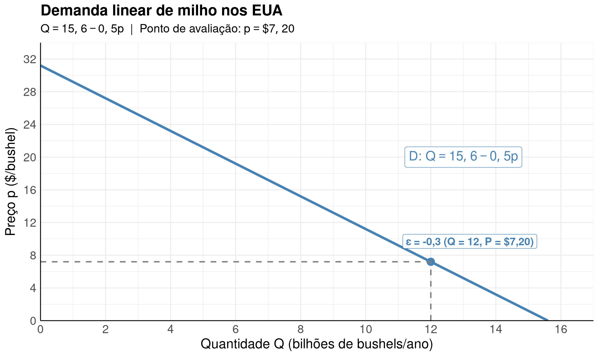 suppressPackageStartupMessages({library(ggplot2)library(dplyr)library(latex2exp)})# Parâmetros da demanda: Q = 15.6 - 0.5*p => p = 31.2 - 2*Q (convenção: P no eixo y)a <-15.6b <-0.5# Curva de demanda: Q de 0 a 15.6q_seq <-seq(0, 15.6, by =0.1)p_seq <- (a - q_seq) / b # p = (a - Q) / b = 31.2 - 2*Qdados_demanda <-data.frame(q = q_seq, p = p_seq)# Ponto de avaliaçãoq0 <-12p0 <-7.20eps <--b * (p0 / q0) # -0.3ggplot() +geom_line(data = dados_demanda,aes(x = q, y = p),color ="steelblue",linewidth =1.4 ) +geom_point(aes(x = q0, y = p0),color ="steelblue",size =4 ) +geom_segment(aes(x = q0, xend = q0, y =0, yend = p0),linetype ="dashed", color ="gray50", linewidth =0.8 ) +geom_segment(aes(x =0, xend = q0, y = p0, yend = p0),linetype ="dashed", color ="gray50", linewidth =0.8 ) +annotate("label", x = q0 +1.2, y = p0 +2.5,label ="\u03B5 = -0,3 (Q = 12, P = $7,20)",fill ="white", label.size =0.3,size =4.5, color ="steelblue", fontface ="bold" ) +annotate("label", x =13, y =20,label =TeX(r"(D: $Q = 15{,}6 - 0{,}5p$)"),fill ="white", label.size =0.3,size =5.5, color ="steelblue" ) +scale_x_continuous(breaks =seq(0, 16, by =2),limits =c(0, 17),expand =c(0, 0) ) +scale_y_continuous(breaks =seq(0, 32, by =4),limits =c(0, 34),expand =c(0, 0) ) +labs(title ="Demanda linear de milho nos EUA",subtitle =TeX(r"($Q = 15{,}6 - 0{,}5p$ | Ponto de avaliação: $p = \$7{,}20$)"),x =TeX(r"(Quantidade $Q$ (bilhões de bushels/ano))"),y =TeX(r"(Preço $p$ (\$/bushel))") ) +theme_minimal() +theme(plot.title =element_text(size =18, face ="bold"),plot.subtitle =element_text(size =14),axis.line =element_line(color ="black", linewidth =0.5),axis.title =element_text(size =16, face ="bold"),axis.text =element_text(size =14),legend.text =element_text(size =13),legend.position ="bottom" )
