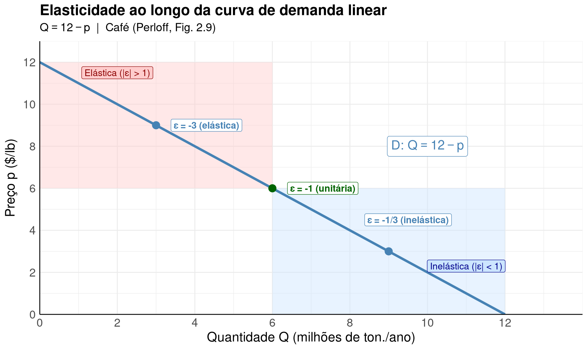 suppressPackageStartupMessages({library(ggplot2)library(dplyr)library(latex2exp)})# Demanda de café: Q = 12 - p => p = 12 - Q (P no eixo y)q_seq <-seq(0, 12, by =0.1)p_seq <-12- q_seqdados <-data.frame(q = q_seq, p = p_seq)# Pontos de avaliaçãopts <-data.frame(q =c(9, 6, 3),p =c(3, 6, 9),eps =c(-1/3, -1, -3),lab =c("ε = −1/3\n(inelástica)", "ε = −1\n(unitária)", "ε = −3\n(elástica)"))ggplot() +# Região inelástica (p < 6)annotate("rect",xmin =6, xmax =12, ymin =0, ymax =6,fill ="#cce5ff", alpha =0.45 ) +# Região elástica (p > 6)annotate("rect",xmin =0, xmax =6, ymin =6, ymax =12,fill ="#ffcccc", alpha =0.45 ) +# Curva de demandageom_line(data = dados,aes(x = q, y = p),color ="steelblue",linewidth =1.4 ) +# Pontos marcadosgeom_point(data = pts,aes(x = q, y = p),color =c("steelblue", "darkgreen", "steelblue"),size =4 ) +# Rótulos de elasticidadeannotate("label", x =9+0.5, y =4.5,label ="\u03B5 = -1/3 (inel\u00E1stica)",fill ="white", label.size =0.3,size =4, color ="steelblue", fontface ="bold" ) +annotate("label", x =6+1.3, y =6,label ="\u03B5 = -1 (unit\u00E1ria)",fill ="white", label.size =0.3,size =4, color ="darkgreen", fontface ="bold" ) +annotate("label", x =3+1.3, y =9,label ="\u03B5 = -3 (el\u00E1stica)",fill ="white", label.size =0.3,size =4, color ="steelblue", fontface ="bold" ) +# Anotações de regiõesannotate("label", x =2, y =11.5,label ="El\u00E1stica (|\u03B5| > 1)",fill ="#ffcccc", label.size =0.3,size =4, color ="darkred" ) +annotate("label", x =11, y =2.3,label ="Inel\u00E1stica (|\u03B5| < 1)",fill ="#cce5ff", label.size =0.3,size =4, color ="darkblue" ) +annotate("label", x =10, y =8,label =TeX(r"(D: $Q = 12 - p$)"),fill ="white", label.size =0.3,size =5.5, color ="steelblue" ) +scale_x_continuous(breaks =seq(0, 12, by =2),limits =c(0, 14),expand =c(0, 0) ) +scale_y_continuous(breaks =seq(0, 12, by =2),limits =c(0, 13),expand =c(0, 0) ) +labs(title ="Elasticidade ao longo da curva de demanda linear",subtitle =TeX(r"($Q = 12 - p$ | Café (Perloff, Fig. 2.9))"),x =TeX(r"(Quantidade $Q$ (milhões de ton./ano))"),y =TeX(r"(Preço $p$ (\$/lb))") ) +theme_minimal() +theme(axis.line =element_line(color ="black", linewidth =0.5),plot.title =element_text(size =18, face ="bold"),plot.subtitle =element_text(size =14),axis.title =element_text(size =16, face ="bold"),axis.text =element_text(size =14),legend.text =element_text(size =13),legend.position ="bottom" )