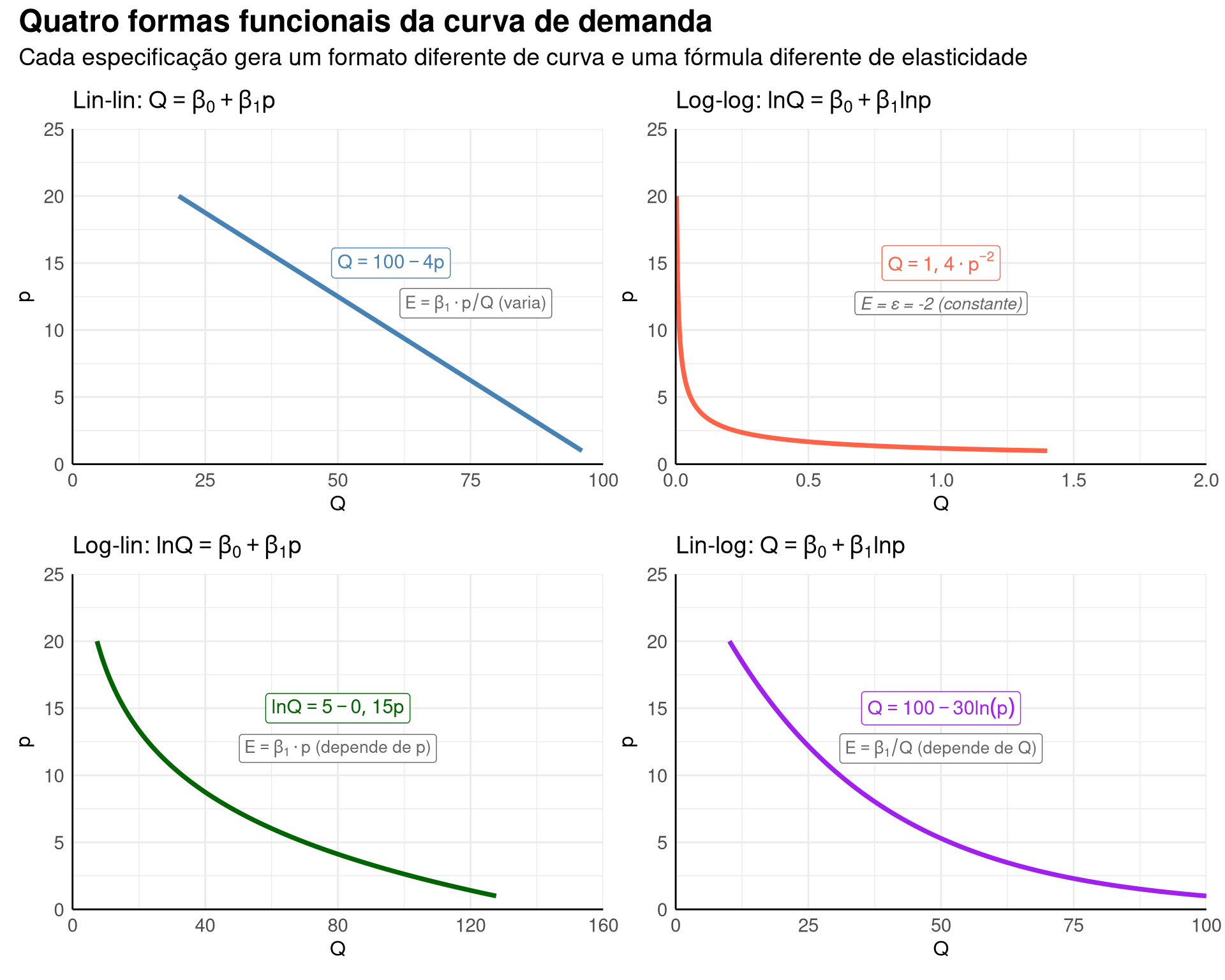 suppressPackageStartupMessages({library(ggplot2)library(patchwork)library(latex2exp)})# Tema comumtema <-theme_minimal() +theme(plot.title =element_text(size =14, face ="bold"),plot.subtitle =element_text(size =11),axis.line =element_line(color ="black", linewidth =0.5),axis.title =element_text(size =12, face ="bold"),axis.text =element_text(size =11) )p_seq <-seq(1, 20, length.out =300)# 1. Lin-lin: Q = 100 - 4pq_linlin <-100-4* p_seqd_linlin <-data.frame(p = p_seq, q = q_linlin)d_linlin <- d_linlin[d_linlin$q >0, ]p1 <-ggplot(d_linlin, aes(x = q, y = p)) +geom_line(color ="steelblue", linewidth =1.3) +annotate("label", x =60, y =15,label =TeX(r"($Q = 100 - 4p$)"),fill ="white", label.size =0.3,size =4, color ="steelblue") +annotate("label", x =76, y =12,label =TeX(r"($E = \beta_1 \cdot p / Q$ (varia))"),fill ="white", label.size =0.3,size =3.5, color ="gray40", fontface ="italic") +scale_x_continuous(limits =c(0, 100), expand =c(0, 0)) +scale_y_continuous(limits =c(0, 25), expand =c(0, 0)) +labs(title =TeX(r"(Lin-lin: $Q = \beta_0 + \beta_1 p$)"),x =TeX(r"($Q$)"),y =TeX(r"($p$)") ) + tema# 2. Log-log: Q = 1.4 * p^(-2) => curva convexaq_loglog <-1.4* p_seq^(-2)d_loglog <-data.frame(p = p_seq, q = q_loglog)d_loglog <- d_loglog[d_loglog$q <=2, ]p2 <-ggplot(d_loglog, aes(x = q, y = p)) +geom_line(color ="tomato", linewidth =1.3) +annotate("label", x =1.0, y =15,label =TeX(r"($Q = 1{,}4 \cdot p^{-2}$)"),fill ="white", label.size =0.3,size =4, color ="tomato") +annotate("label", x =1.0, y =12,label ="E = \u03B5 = -2 (constante)",fill ="white", label.size =0.3,size =3.5, color ="gray40", fontface ="italic") +scale_x_continuous(limits =c(0, 2), expand =c(0, 0)) +scale_y_continuous(limits =c(0, 25), expand =c(0, 0)) +labs(title =TeX(r"(Log-log: $\ln Q = \beta_0 + \beta_1 \ln p$)"),x =TeX(r"($Q$)"),y =TeX(r"($p$)") ) + tema# 3. Log-lin: ln Q = 5 - 0.15p => Q = exp(5 - 0.15p)q_loglin <-exp(5-0.15* p_seq)d_loglin <-data.frame(p = p_seq, q = q_loglin)p3 <-ggplot(d_loglin, aes(x = q, y = p)) +geom_line(color ="darkgreen", linewidth =1.3) +annotate("label", x =80, y =15,label =TeX(r"($\ln Q = 5 - 0{,}15p$)"),fill ="white", label.size =0.3,size =4, color ="darkgreen") +annotate("label", x =80, y =12,label =TeX(r"($E = \beta_1 \cdot p$ (depende de $p$))"),fill ="white", label.size =0.3,size =3.5, color ="gray40", fontface ="italic") +scale_x_continuous(limits =c(0, 160), expand =c(0, 0)) +scale_y_continuous(limits =c(0, 25), expand =c(0, 0)) +labs(title =TeX(r"(Log-lin: $\ln Q = \beta_0 + \beta_1 p$)"),x =TeX(r"($Q$)"),y =TeX(r"($p$)") ) + tema# 4. Lin-log: Q = 100 - 30 ln(p)q_linlog <-100-30*log(p_seq)d_linlog <-data.frame(p = p_seq, q = q_linlog)d_linlog <- d_linlog[d_linlog$q >0, ]p4 <-ggplot(d_linlog, aes(x = q, y = p)) +geom_line(color ="purple", linewidth =1.3) +annotate("label", x =50, y =15,label =TeX(r"($Q = 100 - 30 \ln(p)$)"),fill ="white", label.size =0.3,size =4, color ="purple") +annotate("label", x =50, y =12,label =TeX(r"($E = \beta_1 / Q$ (depende de $Q$))"),fill ="white", label.size =0.3,size =3.5, color ="gray40", fontface ="italic") +scale_x_continuous(limits =c(0, 100), expand =c(0, 0)) +scale_y_continuous(limits =c(0, 25), expand =c(0, 0)) +labs(title =TeX(r"(Lin-log: $Q = \beta_0 + \beta_1 \ln p$)"),x =TeX(r"($Q$)"),y =TeX(r"($p$)") ) + tema(p1 + p2) / (p3 + p4) +plot_annotation(title ="Quatro formas funcionais da curva de demanda",subtitle ="Cada especificação gera um formato diferente de curva e uma fórmula diferente de elasticidade",theme =theme(plot.title =element_text(size =18, face ="bold"),plot.subtitle =element_text(size =14) ) )