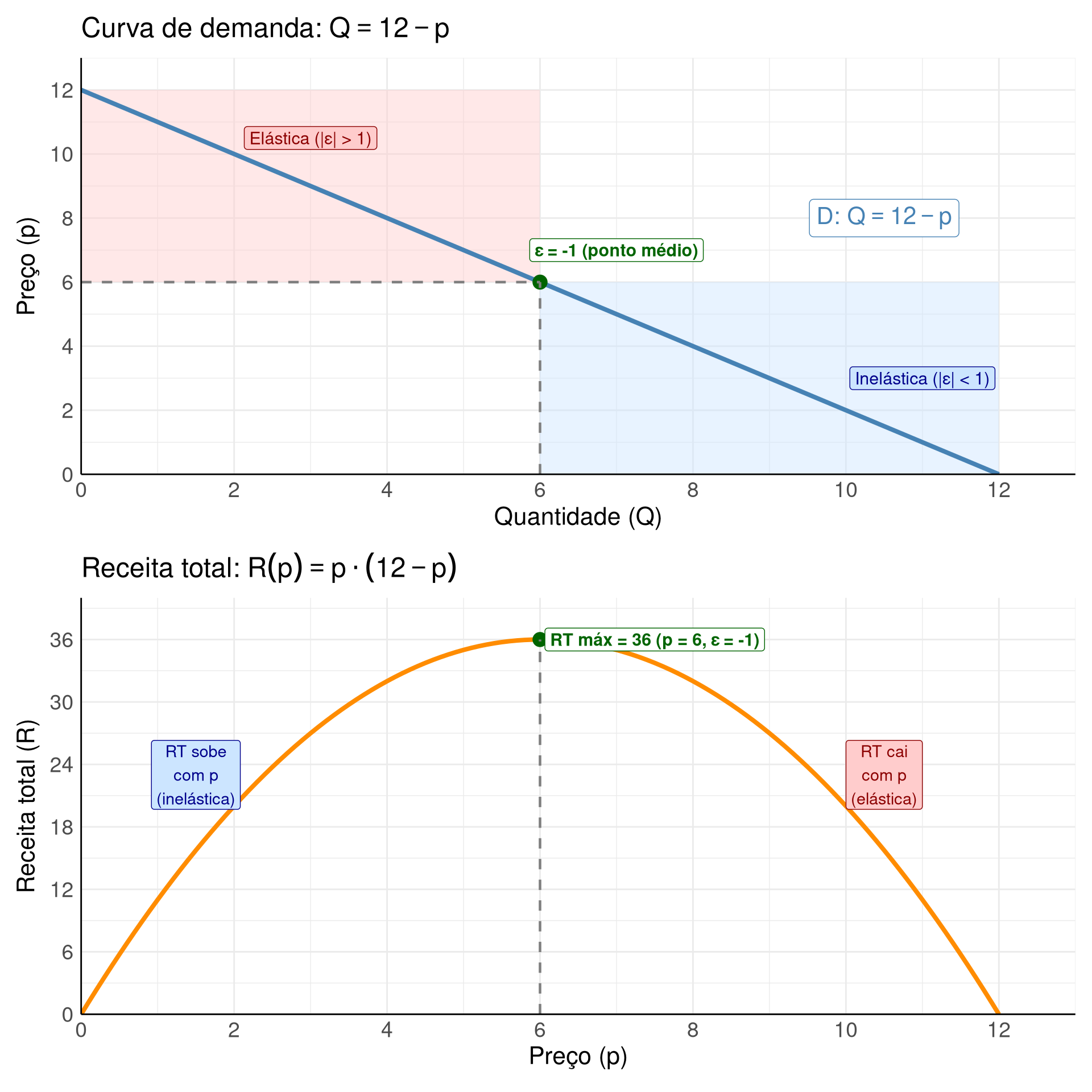 suppressPackageStartupMessages({library(ggplot2)library(dplyr)library(patchwork)library(latex2exp)})# Demanda linear: Q = 12 - p => p = 12 - Q# Receita total: R(p) = p * (12 - p) = 12p - p^2q_seq <-seq(0, 12, by =0.1)p_seq <-12- q_seq # p no eixo ydados_d <-data.frame(q = q_seq, p = p_seq)# Painel superior: curva de demanda com regiõesp_demand <-ggplot() +# Região inelástica (p < 6, q > 6)annotate("rect",xmin =6, xmax =12, ymin =0, ymax =6,fill ="#cce5ff", alpha =0.45 ) +# Região elástica (p > 6, q < 6)annotate("rect",xmin =0, xmax =6, ymin =6, ymax =12,fill ="#ffcccc", alpha =0.45 ) +geom_line(data = dados_d,aes(x = q, y = p),color ="steelblue",linewidth =1.4 ) +geom_point(aes(x =6, y =6), color ="darkgreen", size =4) +geom_segment(aes(x =6, xend =6, y =0, yend =6),linetype ="dashed", color ="gray50", linewidth =0.8 ) +geom_segment(aes(x =0, xend =6, y =6, yend =6),linetype ="dashed", color ="gray50", linewidth =0.8 ) +annotate("label", x =6+1.0, y =7,label ="\u03B5 = -1 (ponto m\u00E9dio)",fill ="white", label.size =0.3,size =4, color ="darkgreen", fontface ="bold" ) +annotate("label", x =3, y =10.5,label ="El\u00E1stica (|\u03B5| > 1)",fill ="#ffcccc", label.size =0.3,size =4, color ="darkred" ) +annotate("label", x =11, y =3,label ="Inel\u00E1stica (|\u03B5| < 1)",fill ="#cce5ff", label.size =0.3,size =4, color ="darkblue" ) +annotate("label", x =10.5, y =8,label =TeX(r"(D: $Q = 12 - p$)"),fill ="white", label.size =0.3,size =5.5, color ="steelblue" ) +scale_x_continuous(breaks =seq(0, 12, by =2),limits =c(0, 13),expand =c(0, 0) ) +scale_y_continuous(breaks =seq(0, 12, by =2),limits =c(0, 13),expand =c(0, 0) ) +labs(title =TeX(r"(Curva de demanda: $Q = 12 - p$)"),x =TeX(r"(Quantidade ($Q$))"),y =TeX(r"(Preço ($p$))") ) +theme_minimal() +theme(plot.title =element_text(size =18, face ="bold"),plot.subtitle =element_text(size =14),axis.line =element_line(color ="black", linewidth =0.5),axis.title =element_text(size =16, face ="bold"),axis.text =element_text(size =14),legend.text =element_text(size =13),legend.position ="bottom" )# Painel inferior: receita total R(p) = p*(12-p)p_vals <-seq(0, 12, by =0.1)r_vals <- p_vals * (12- p_vals)dados_r <-data.frame(p = p_vals, r = r_vals)p_revenue <-ggplot() +geom_line(data = dados_r,aes(x = p, y = r),color ="darkorange",linewidth =1.4 ) +geom_point(aes(x =6, y =36), color ="darkgreen", size =4) +geom_segment(aes(x =6, xend =6, y =0, yend =36),linetype ="dashed", color ="gray50", linewidth =0.8 ) +annotate("label", x =6+1.5, y =36,label ="RT m\u00E1x = 36 (p = 6, \u03B5 = -1)",fill ="white", label.size =0.3,size =4, color ="darkgreen", fontface ="bold" ) +annotate("label", x =1.5, y =23,label ="RT sobe\ncom p\n(inelástica)",fill ="#cce5ff", label.size =0.3,size =3.8, color ="darkblue" ) +annotate("label", x =10.5, y =23,label ="RT cai\ncom p\n(elástica)",fill ="#ffcccc", label.size =0.3,size =3.8, color ="darkred" ) +scale_x_continuous(breaks =seq(0, 12, by =2),limits =c(0, 13),expand =c(0, 0) ) +scale_y_continuous(breaks =seq(0, 36, by =6),limits =c(0, 40),expand =c(0, 0) ) +labs(title =TeX(r"(Receita total: $R(p) = p \cdot (12 - p)$)"),x =TeX(r"(Preço ($p$))"),y =TeX(r"(Receita total ($R$))") ) +theme_minimal() +theme(plot.title =element_text(size =18, face ="bold"),plot.subtitle =element_text(size =14),axis.line =element_line(color ="black", linewidth =0.5),axis.title =element_text(size =16, face ="bold"),axis.text =element_text(size =14),legend.text =element_text(size =13),legend.position ="bottom" )p_demand / p_revenue