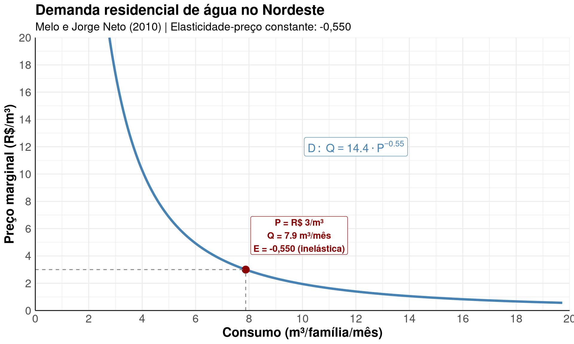 suppressPackageStartupMessages({library(ggplot2)})# Função de demanda reduzida: ln Q = 2.668 - 0.550 ln P# Q = exp(2.668) * P^(-0.550)A <-exp(2.668)eps <--0.550p_seq <-seq(0.5, 20, length.out =300)q_seq <- A * p_seq^epsdados <-data.frame(p = p_seq, q = q_seq)# Ponto de referência: preço médio ~ R$ 3/m³p_ref <-3q_ref <- A * p_ref^epsggplot() +geom_line(data = dados,aes(x = q, y = p),color ="steelblue",linewidth =1.4 ) +geom_point(aes(x = q_ref, y = p_ref),color ="darkred", size =4 ) +geom_segment(aes(x = q_ref, xend = q_ref, y =0, yend = p_ref),linetype ="dashed", color ="gray50" ) +geom_segment(aes(x =0, xend = q_ref, y = p_ref, yend = p_ref),linetype ="dashed", color ="gray50" ) +annotate("label", x = q_ref +2, y = p_ref +2.5,label =paste0("P = R$ ", p_ref, "/m³\n","Q = ", round(q_ref, 1), " m³/mês\n","E = -0,550 (inelástica)" ),fill ="white", label.size =0.3,size =4, color ="darkred", fontface ="bold" ) +annotate("label", x =12, y =12,label ="D:~Q == 14.4 %.% P^{-0.55}",parse =TRUE,fill ="white", label.size =0.3,size =5, color ="steelblue" ) +scale_x_continuous(breaks =seq(0, 20, by =2),limits =c(0, 20),expand =c(0, 0) ) +scale_y_continuous(breaks =seq(0, 20, by =2),limits =c(0, 20),expand =c(0, 0) ) +labs(title ="Demanda residencial de água no Nordeste",subtitle ="Melo e Jorge Neto (2010) | Elasticidade-preço constante: -0,550",x ="Consumo (m³/família/mês)",y ="Preço marginal (R$/m³)" ) +theme_minimal() +theme(plot.title =element_text(size =18, face ="bold"),plot.subtitle =element_text(size =14),axis.line =element_line(color ="black", linewidth =0.5),axis.title =element_text(size =16, face ="bold"),axis.text =element_text(size =14),legend.text =element_text(size =13),legend.position ="bottom" )