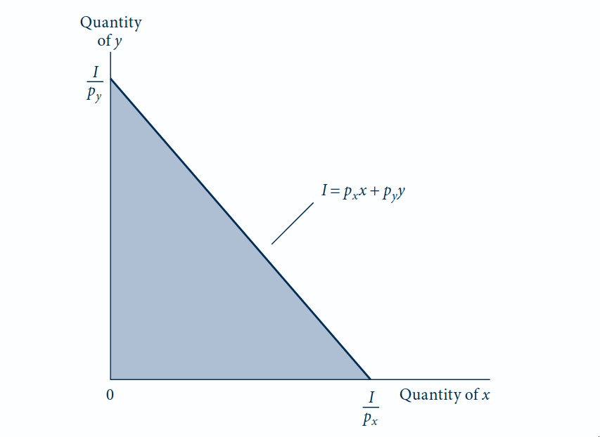 O conjunto orçamentário é a área triangular abaixo da reta: todas as cestas \((x, y)\) com \(p_x x + p_y y \leq I\).
