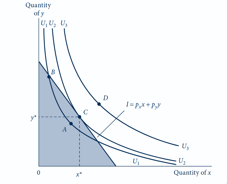 O ponto ótimo é onde a curva de indiferença mais alta é tangente à restrição orçamentária: o ponto \(C = (x^*, y^*)\).