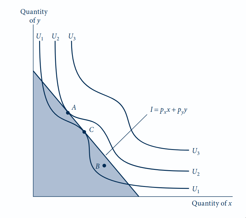 No ponto \(C\), a inclinação da curva de indiferença (TMS) iguala a inclinação da restrição orçamentária (\(p_x/p_y\)): condição de ótimo.