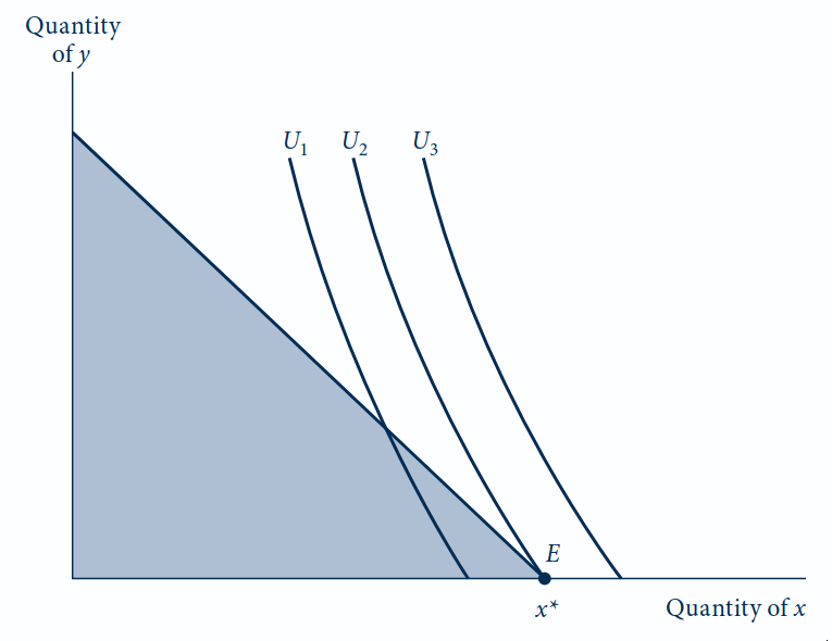 Caso ilustrado: o consumidor prefere tão fortemente o bem \(x\) que, no ótimo, \(y^* = 0\) e toda a renda é gasta em \(x\).