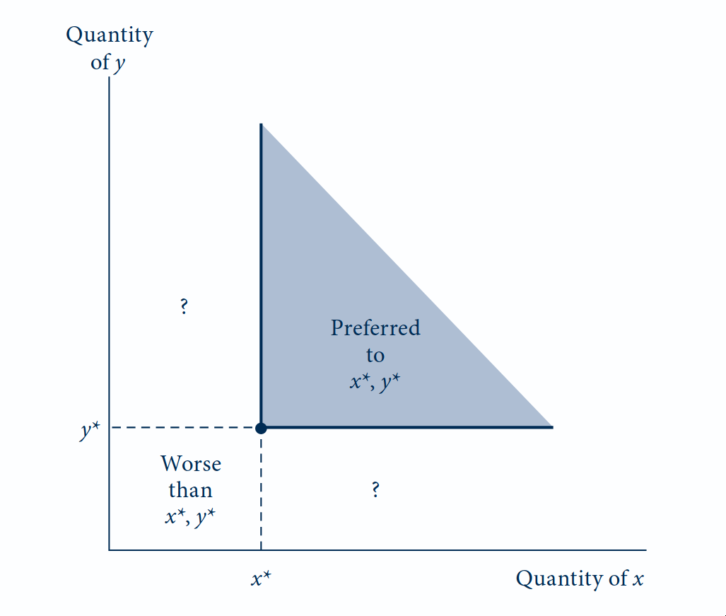 A área sombreada representa as combinações de \(x\) e \(y\) que são inequivocamente preferidas a \((x^*, y^*)\): ceteris paribus, indivíduos preferem mais de qualquer bem a menos. A área oposta é inequivocamente pior.