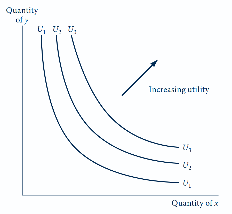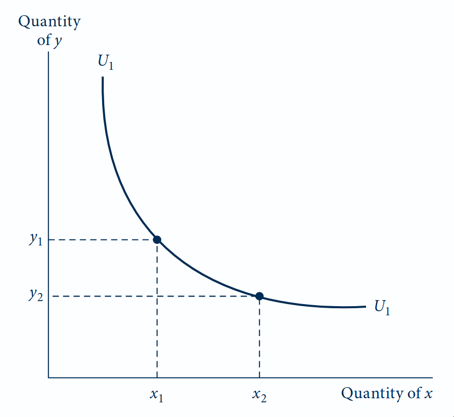A curva \(U_1\) representa todas as combinações de \(x\) e \(y\) que proporcionam o mesmo nível de utilidade ao indivíduo.