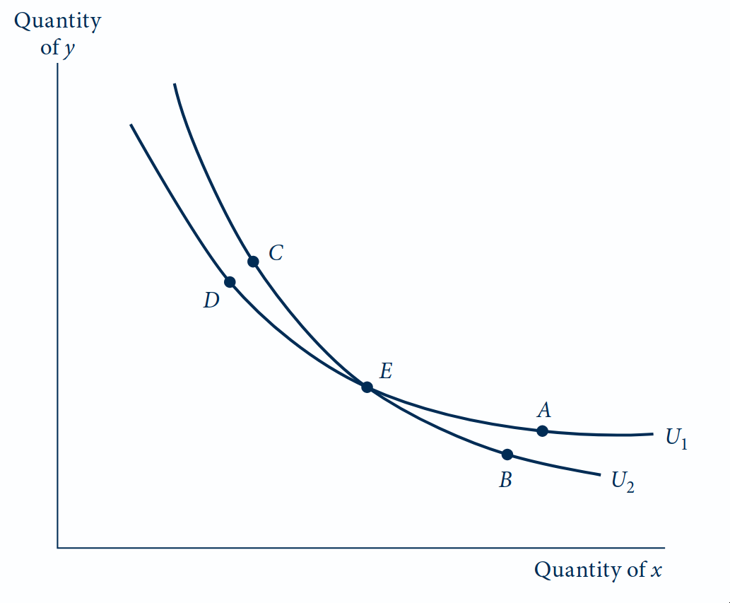 Suponha que duas curvas \(U_1\) e \(U_2\) se cruzem no ponto \(E\).