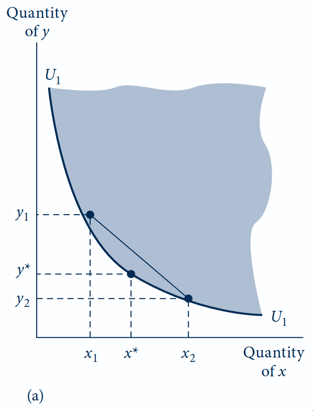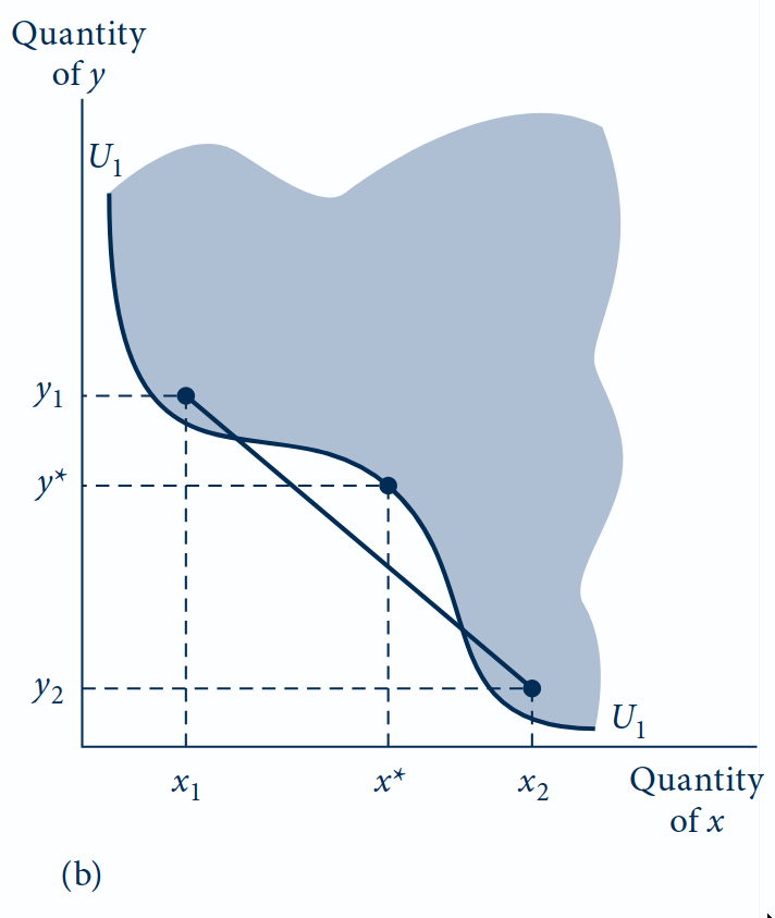 (a) Convexa: o consumidor é indiferente entre \((x_1, y_1)\) e \((x_2, y_2)\). O segmento que liga esses pontos fica inteiramente dentro da área sombreada. Qualquer combinação intermediária (como \((x^*, y^*)\)) é preferida aos extremos. A TMS é decrescente: conforme se move pela curva, a inclinação fica mais plana.