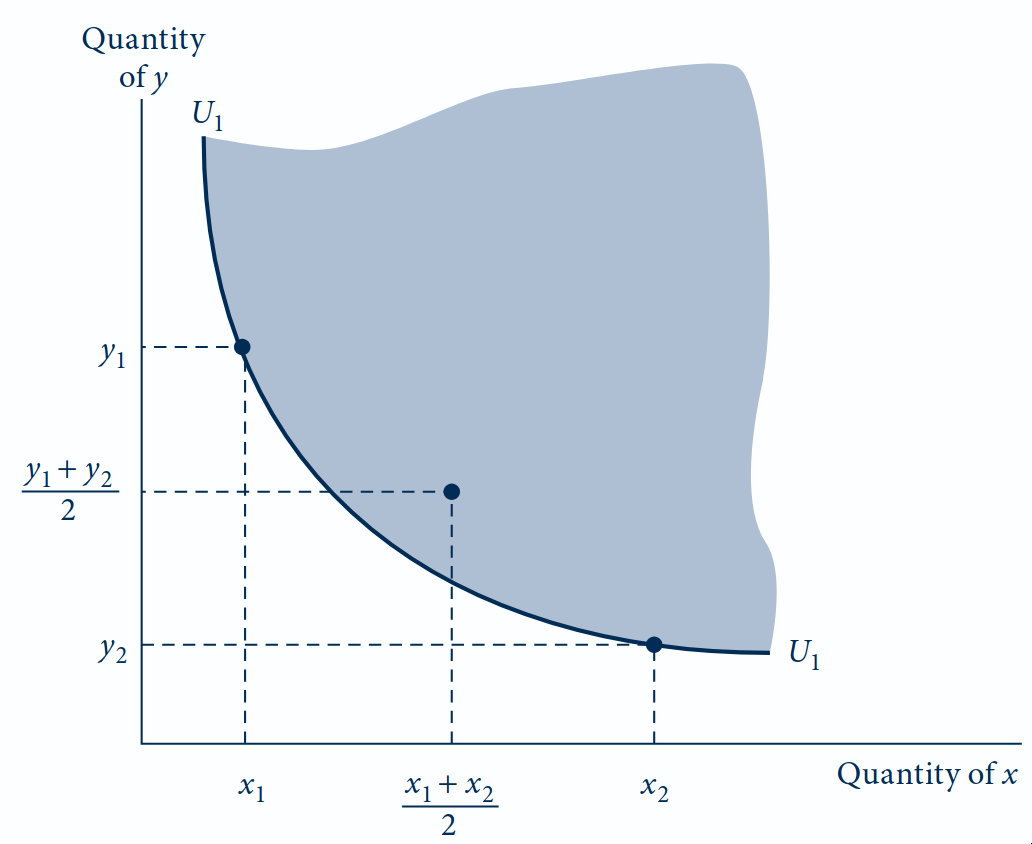 As cestas \((x_1, y_1)\) e \((x_2, y_2)\) estão sobre a curva \(U_1\): ambas proporcionam utilidade \(U_1\). O ponto médio está acima de \(U_1\) (dentro da área sombreada), proporcionando utilidade maior: \(U\left(\frac{x_1+x_2}{2}, \frac{y_1+y_2}{2}\right) > U_1\).