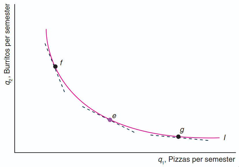 A curva ilustra uma TMS decrescente: a inclinação da curva de indiferença se torna mais plana conforme nos movemos para baixo e para a direita ao longo da curva (do ponto \(f\) para \(e\) e depois para \(g\)).