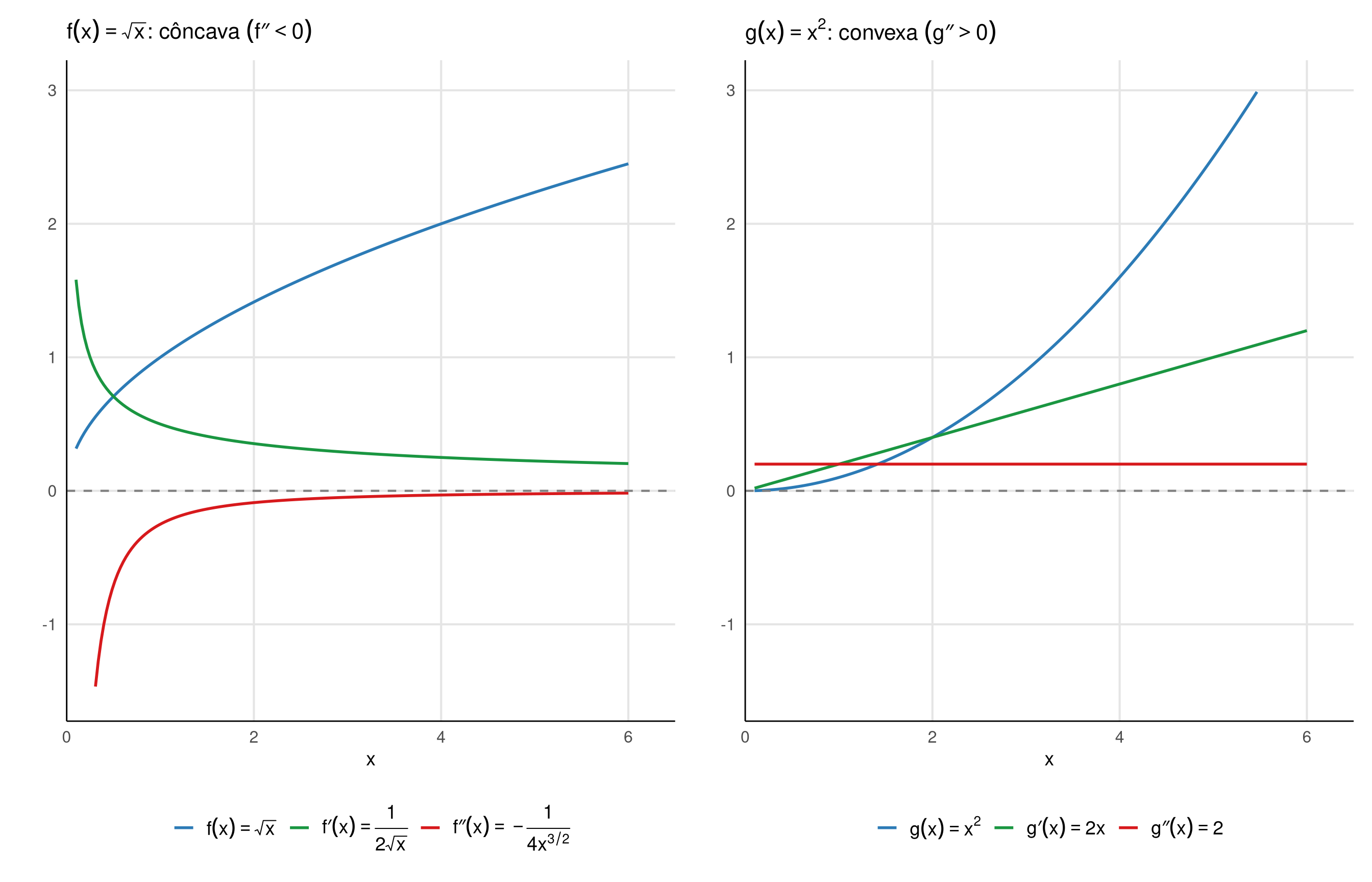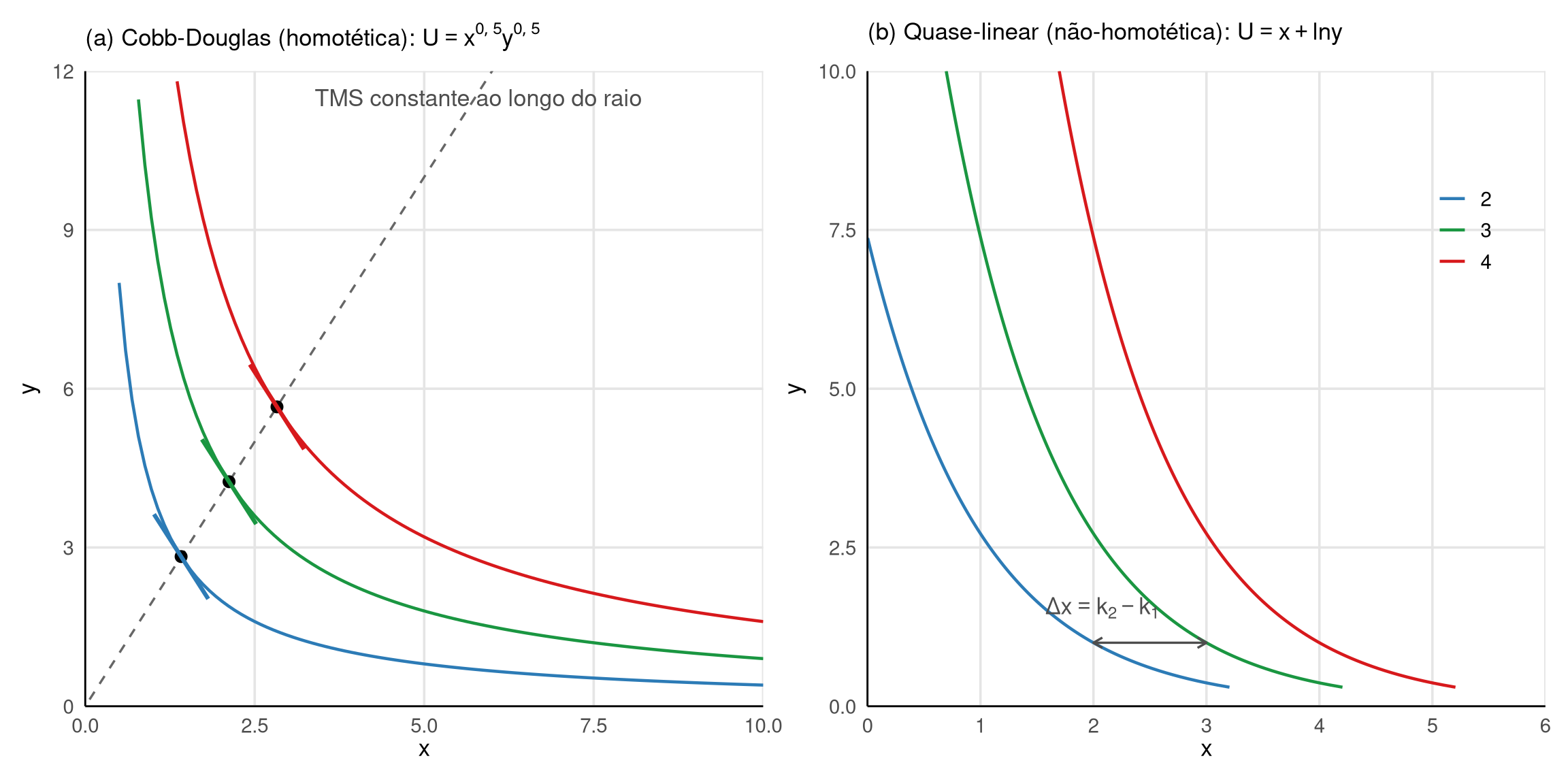 suppressPackageStartupMessages({library(ggplot2)library(patchwork)library(latex2exp)})# --- Painel (a): Cobb-Douglas (homotética) ---# U = x^0.5 * y^0.5 = k => y = k^2 / xniveis_cd <-c(2, 3, 4)cores_cd <-c("#2c7bb6", "#1a9641", "#d7191c")# Raio y = 2x: pontos de interseção com cada IC# y = k^2 / x e y = 2x => 2x = k^2/x => x^2 = k^2/2 => x = k/sqrt(2)intersecoes_cd <-data.frame(k = niveis_cd,x = niveis_cd /sqrt(2),y = niveis_cd *sqrt(2))# TMS em cada ponto: TMS = y/x = 2 (constante ao longo do raio y = 2x)# Segmento tangente: inclinação = -TMS = -2# Comprimento do segmento: delta_x = 0.4delta_x <-0.4tangentes_cd <- intersecoes_cd |> dplyr::mutate(x0 = x - delta_x,x1 = x + delta_x,y0 = y +2* delta_x,y1 = y -2* delta_x )p1 <- ggplot2::ggplot() + purrr::map(seq_along(niveis_cd), \(i) ggplot2::geom_function(fun = \(x) niveis_cd[i]^2/ x,xlim =c(0.5, 10),color = cores_cd[i],linewidth =0.8 ) ) + ggplot2::geom_abline(slope =2,intercept =0,linetype ="dashed",color ="grey40",linewidth =0.6 ) + ggplot2::geom_point(data = intersecoes_cd,mapping = ggplot2::aes(x = x, y = y),size =2.5,color ="black" ) + purrr::map(seq_len(nrow(tangentes_cd)), \(i) ggplot2::geom_segment(data = tangentes_cd[i, ],mapping = ggplot2::aes(x = x0, xend = x1, y = y0, yend = y1),color = cores_cd[i],linewidth =1.1 ) ) + ggplot2::annotate("text",x =5.8,y =11.5,label ="TMS constante ao longo do raio",size =4.5,color ="grey30",hjust =0.5 ) + ggplot2::scale_x_continuous(limits =c(0, 10),expand =c(0, 0) ) + ggplot2::scale_y_continuous(limits =c(0, 12),expand =c(0, 0) ) + ggplot2::labs(title = latex2exp::TeX(r"((a) Cobb-Douglas (homotética): $U = x^{0{,}5}y^{0{,}5}$)"),x = latex2exp::TeX(r"($x$)"),y = latex2exp::TeX(r"($y$)") ) + ggplot2::theme_minimal(base_size =14) + ggplot2::theme(axis.line = ggplot2::element_line(color ="black", linewidth =0.5),panel.grid.major = ggplot2::element_line(color ="gray90"),panel.grid.minor = ggplot2::element_blank(),plot.title = ggplot2::element_text(size =13, face ="bold", margin = ggplot2::margin(b =8)),axis.title = ggplot2::element_text(size =13),axis.text = ggplot2::element_text(size =11) )# --- Painel (b): Quase-linear (não-homotética) ---# U = x + ln(y) = k => x = k - ln(y)niveis_ql <-c(2, 3, 4)cores_ql <-c("#2c7bb6", "#1a9641", "#d7191c")seq_y <-seq(0.3, 10, length.out =300)curvas_ql <- purrr::map(seq_along(niveis_ql), \(i) data.frame(y = seq_y,x = niveis_ql[i] -log(seq_y),k = niveis_ql[i] )) |> dplyr::bind_rows() |> dplyr::filter(x >=0, x <=6)# Seta horizontal entre k=2 e k=3, em y=1seta <-data.frame(x0 =2, x1 =3, y =1)p2 <- ggplot2::ggplot(curvas_ql, ggplot2::aes(x = x, y = y, color =factor(k))) + ggplot2::geom_line(linewidth =0.8) + ggplot2::geom_segment(data = seta,mapping = ggplot2::aes(x = x0, xend = x1, y = y, yend = y),arrow = ggplot2::arrow(length = ggplot2::unit(0.2, "cm"), ends ="both"),color ="grey30",linewidth =0.6,inherit.aes =FALSE ) + ggplot2::annotate("text",x =2.08,y =1.55,label = latex2exp::TeX(r"($\Delta x = k_2 - k_1$)"),size =4.5,color ="grey30",hjust =0.5 ) + ggplot2::scale_color_manual(values = cores_ql,labels = latex2exp::TeX(c(r"($k=2$)", r"($k=3$)", r"($k=4$)")) ) + ggplot2::scale_x_continuous(limits =c(0, 6),expand =c(0, 0) ) + ggplot2::scale_y_continuous(limits =c(0, 10),expand =c(0, 0) ) + ggplot2::labs(title = latex2exp::TeX(r"((b) Quase-linear (não-homotética): $U = x + \ln y$)"),x = latex2exp::TeX(r"($x$)"),y = latex2exp::TeX(r"($y$)"),color =NULL ) + ggplot2::theme_minimal(base_size =14) + ggplot2::theme(axis.line = ggplot2::element_line(color ="black", linewidth =0.5),panel.grid.major = ggplot2::element_line(color ="gray90"),panel.grid.minor = ggplot2::element_blank(),plot.title = ggplot2::element_text(size =13, face ="bold", margin = ggplot2::margin(b =8)),axis.title = ggplot2::element_text(size =13),axis.text = ggplot2::element_text(size =11),legend.position ="inside",legend.position.inside =c(0.88, 0.75),legend.text = ggplot2::element_text(size =11) )p1 + p2