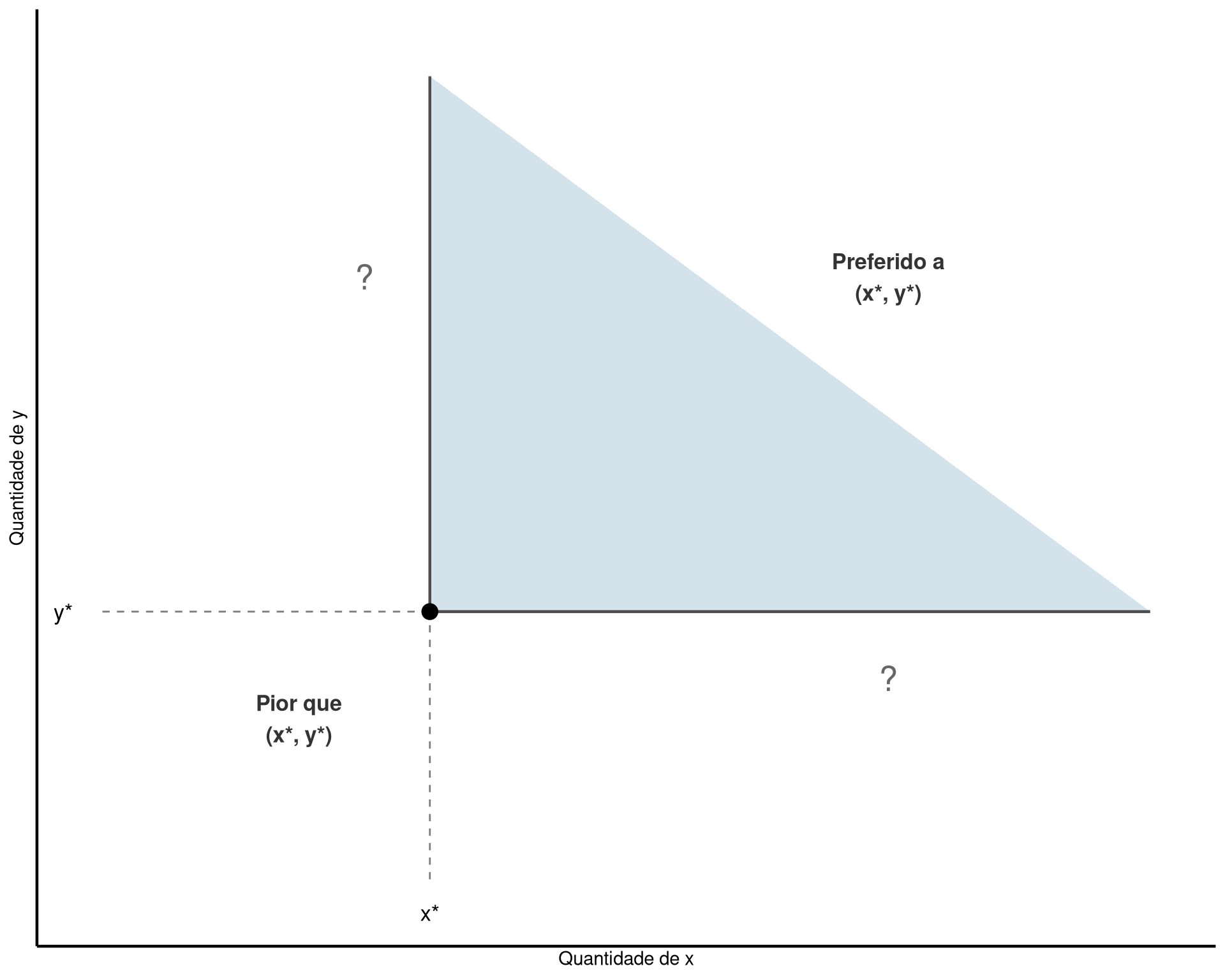 suppressPackageStartupMessages({library(ggplot2)library(dplyr)library(latex2exp)})# Ponto de referência: cesta A = (4, 3)x_star <-2.5y_star <-2# Triângulo "Preferido a (x*, y*)" no quadrante NEtri_df <-data.frame(x =c(x_star, x_star, 8),y =c(y_star, 6, y_star))ggplot2::ggplot() +# Triângulo sombreado: preferido ggplot2::geom_polygon(data = tri_df, ggplot2::aes(x = x, y = y),fill ="#b8cfe0", alpha =0.6 ) +# Linhas sólidas nos limites do ponto de referência ggplot2::geom_segment( ggplot2::aes(x = x_star, y = y_star, xend = x_star, yend =6),color ="gray30", linewidth =0.8 ) + ggplot2::geom_segment( ggplot2::aes(x = x_star, y = y_star, xend =8, yend = y_star),color ="gray30", linewidth =0.8 ) +# Linhas tracejadas até os eixos ggplot2::geom_segment( ggplot2::aes(x = x_star, y =0, xend = x_star, yend = y_star),linetype ="dashed", color ="gray50" ) + ggplot2::geom_segment( ggplot2::aes(x =0, y = y_star, xend = x_star, yend = y_star),linetype ="dashed", color ="gray50" ) +# Rótulos dos quadrantes ggplot2::annotate("text", x =6, y =4.5, label ="Preferido a\n(x*, y*)",size =4.5, color ="gray20", fontface ="bold") + ggplot2::annotate("text", x =1.5, y =1.2, label ="Pior que\n(x*, y*)",size =4.5, color ="gray20", fontface ="bold") + ggplot2::annotate("text", x =2, y =4.5, label ="?",size =7, color ="gray40") + ggplot2::annotate("text", x =6, y =1.5, label ="?",size =7, color ="gray40") +# Ponto de referência ggplot2::geom_point( ggplot2::aes(x = x_star, y = y_star),size =4, color ="black" ) +# Rótulos nos eixos ggplot2::annotate("text", x = x_star, y =-0.25, label ="x*", size =4.5) + ggplot2::annotate("text", x =-0.3, y = y_star, label ="y*", size =4.5) + ggplot2::scale_x_continuous(expand =c(0, 0),limits =c(-0.5, 8.5),breaks =NULL ) + ggplot2::scale_y_continuous(expand =c(0, 0),limits =c(-0.5, 6.5),breaks =NULL ) + ggplot2::labs(x = latex2exp::TeX(r"(Quantidade de $x$)"),y = latex2exp::TeX(r"(Quantidade de $y$)") ) + ggplot2::theme_minimal() + ggplot2::theme(axis.line = ggplot2::element_line(color ="black", linewidth =0.8),panel.grid = ggplot2::element_blank(),axis.text = ggplot2::element_blank(),axis.ticks = ggplot2::element_blank() )