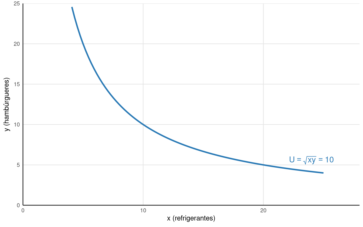 \(V(x,y) = \ln(xy) = \ln x + \ln y\) representa as mesmas preferências, pois \(\ln(\cdot)\) é estritamente crescente.