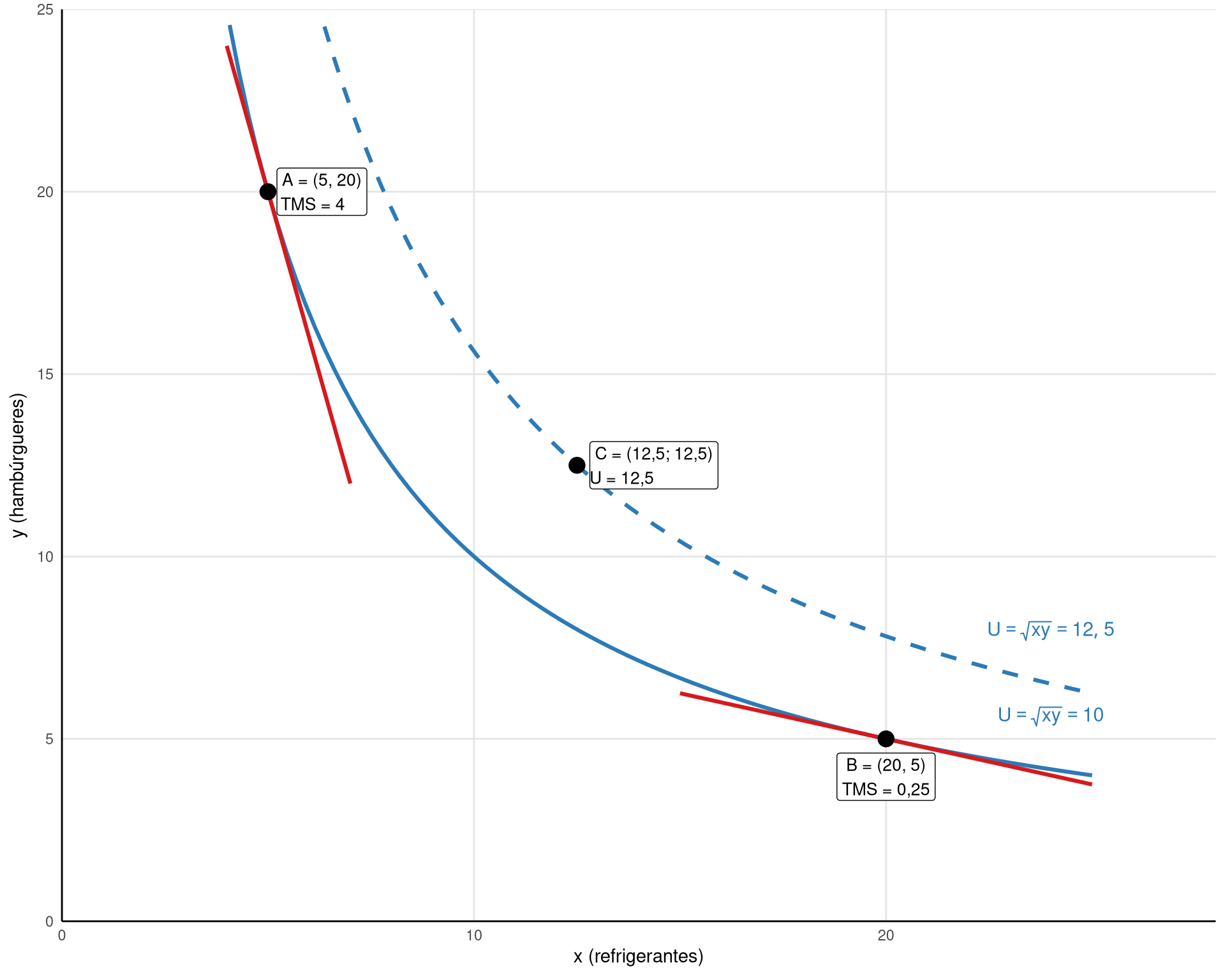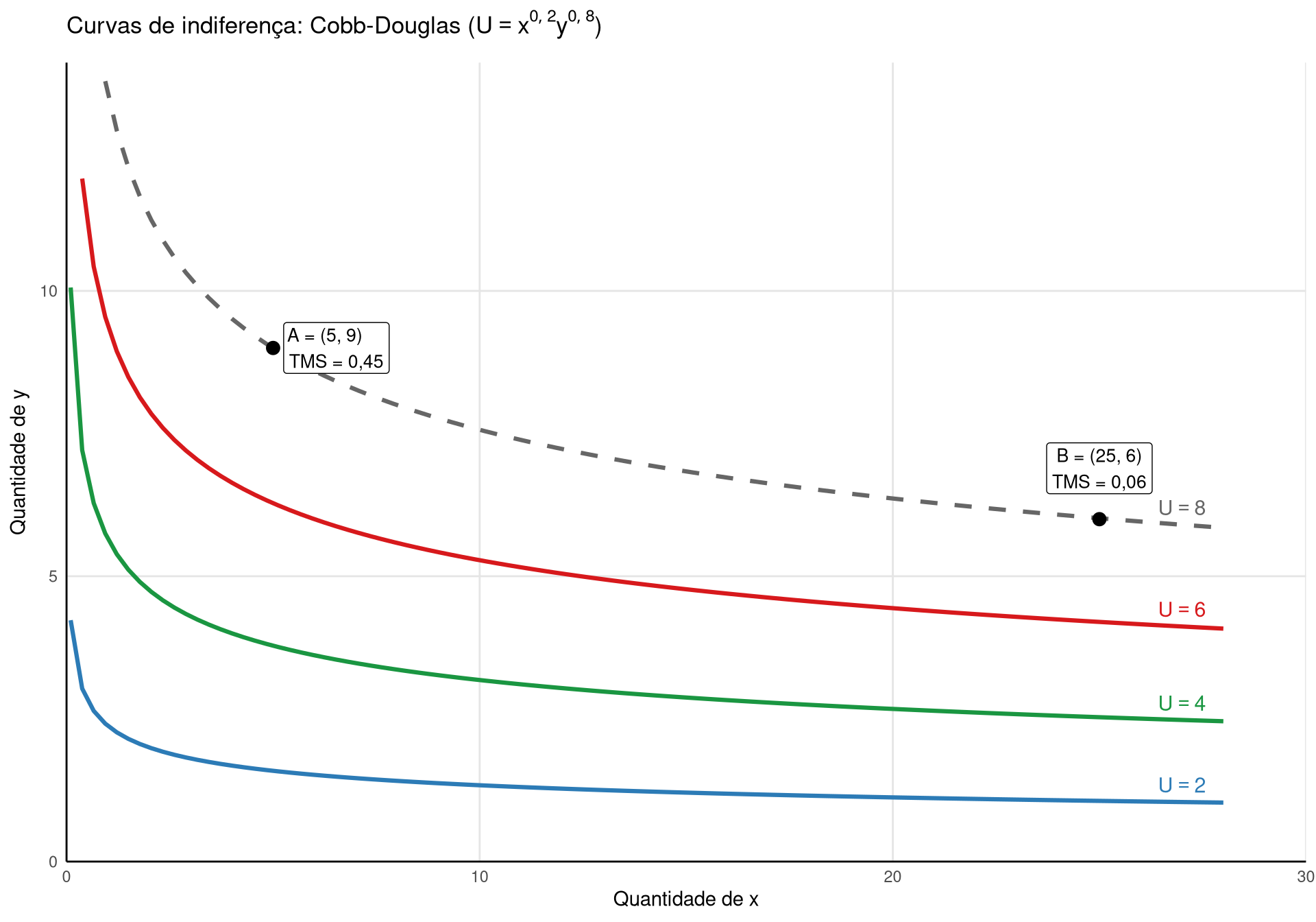 A TMS depende apenas de \(y\), não de \(x\). Isso significa que a disposição a trocar \(y\) por \(x\) depende apenas da quantidade de \(y\) que o consumidor possui, independentemente de quanta \(x\) tem.