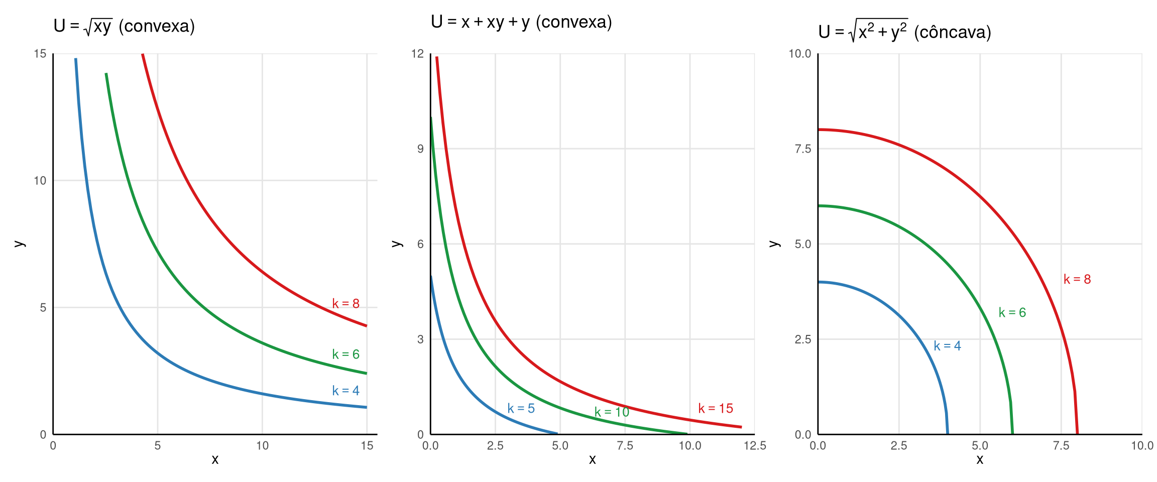 Todas as três funções produzem a mesma ordenação: \(A \sim B \succ C\). As cestas A e B são indiferentes entre si e ambas são preferidas à cesta C.