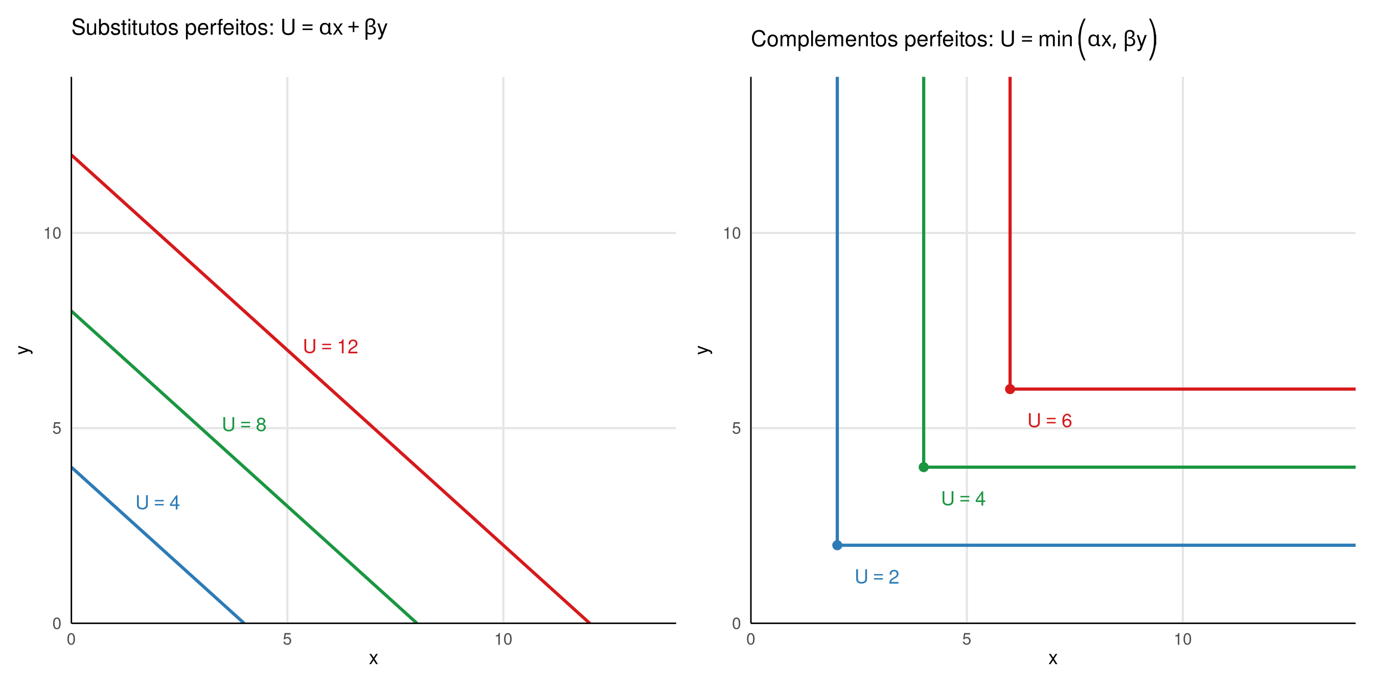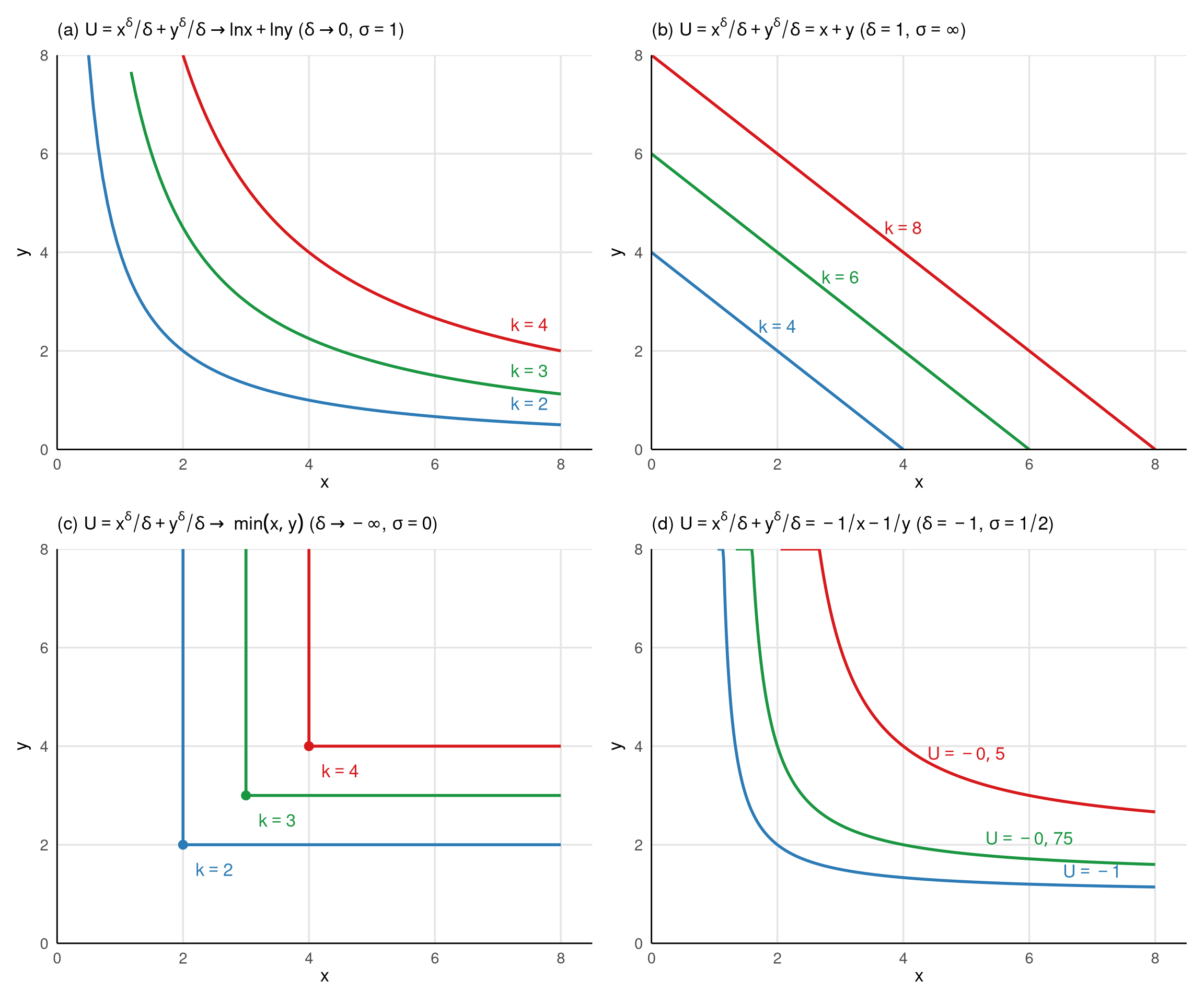 suppressPackageStartupMessages({library(ggplot2)library(latex2exp)library(patchwork)})cores_ces <-c("#2c7bb6", "#1a9641", "#d7191c")tema_ces <- ggplot2::theme_minimal(base_size =14) + ggplot2::theme(axis.line = ggplot2::element_line(color ="black", linewidth =0.5),panel.grid.major = ggplot2::element_line(color ="gray90"),panel.grid.minor = ggplot2::element_blank(),plot.title = ggplot2::element_text(size =13, face ="bold", margin = ggplot2::margin(b =8)),axis.title = ggplot2::element_text(size =13),axis.text = ggplot2::element_text(size =11) )# (a) Cobb-Douglas: y = k^2 / xp_cd <- ggplot2::ggplot() + ggplot2::geom_function(fun = \(x) 2^2/ x, xlim =c(0.5, 8),color = cores_ces[1], linewidth =1.0 ) + ggplot2::geom_function(fun = \(x) 3^2/ x, xlim =c(0.5, 8),color = cores_ces[2], linewidth =1.0 ) + ggplot2::geom_function(fun = \(x) 4^2/ x, xlim =c(0.5, 8),color = cores_ces[3], linewidth =1.0 ) + ggplot2::annotate("text", x =7.5, y =4/7.5+0.4,label = latex2exp::TeX(r"($k=2$)"), color = cores_ces[1], size =4.5) + ggplot2::annotate("text", x =7.5, y =9/7.5+0.4,label = latex2exp::TeX(r"($k=3$)"), color = cores_ces[2], size =4.5) + ggplot2::annotate("text", x =7.5, y =16/7.5+0.4,label = latex2exp::TeX(r"($k=4$)"), color = cores_ces[3], size =4.5) + ggplot2::scale_x_continuous(expand =c(0, 0), limits =c(0, 8.5)) + ggplot2::scale_y_continuous(expand =c(0, 0), limits =c(0, 8)) + ggplot2::labs(title = latex2exp::TeX(r"((a) $U = x^{\delta}/\delta + y^{\delta}/\delta \rightarrow \ln x + \ln y$ ($\delta \rightarrow 0$, $\sigma = 1$))"),x = latex2exp::TeX(r"($x$)"),y = latex2exp::TeX(r"($y$)") ) + tema_ces# (b) Substitutos perfeitos: y = k - xp_sp <- ggplot2::ggplot() + ggplot2::geom_function(fun = \(x) 4- x, xlim =c(0, 4),color = cores_ces[1], linewidth =1.0 ) + ggplot2::geom_function(fun = \(x) 6- x, xlim =c(0, 6),color = cores_ces[2], linewidth =1.0 ) + ggplot2::geom_function(fun = \(x) 8- x, xlim =c(0, 8),color = cores_ces[3], linewidth =1.0 ) + ggplot2::annotate("text", x =2, y =4-2+0.5,label = latex2exp::TeX(r"($k=4$)"), color = cores_ces[1], size =4.5) + ggplot2::annotate("text", x =3, y =6-3+0.5,label = latex2exp::TeX(r"($k=6$)"), color = cores_ces[2], size =4.5) + ggplot2::annotate("text", x =4, y =8-4+0.5,label = latex2exp::TeX(r"($k=8$)"), color = cores_ces[3], size =4.5) + ggplot2::scale_x_continuous(expand =c(0, 0), limits =c(0, 8.5)) + ggplot2::scale_y_continuous(expand =c(0, 0), limits =c(0, 8)) + ggplot2::labs(title = latex2exp::TeX(r"((b) $U = x^{\delta}/\delta + y^{\delta}/\delta = x + y$ ($\delta = 1$, $\sigma = \infty$))"),x = latex2exp::TeX(r"($x$)"),y = latex2exp::TeX(r"($y$)") ) + tema_ces# (c) Complementos perfeitos: L-shapes com vértice em (k, k)# Construir data frame com todos os segmentosdf_cp_segs <-do.call(rbind, lapply(seq_along(c(2, 3, 4)), function(i) { k <-c(2, 3, 4)[i]rbind(data.frame(x = k, y = k, xend =8, yend = k, grupo =paste0("k=", k)),data.frame(x = k, y = k, xend = k, yend =8, grupo =paste0("k=", k)) )}))df_cp_pts <-data.frame(x =c(2, 3, 4), y =c(2, 3, 4),cor = cores_ces)p_cp <- ggplot2::ggplot() + ggplot2::geom_segment(data = df_cp_segs[df_cp_segs$grupo =="k=2", ], ggplot2::aes(x = x, y = y, xend = xend, yend = yend),color = cores_ces[1], linewidth =1.0 ) + ggplot2::geom_segment(data = df_cp_segs[df_cp_segs$grupo =="k=3", ], ggplot2::aes(x = x, y = y, xend = xend, yend = yend),color = cores_ces[2], linewidth =1.0 ) + ggplot2::geom_segment(data = df_cp_segs[df_cp_segs$grupo =="k=4", ], ggplot2::aes(x = x, y = y, xend = xend, yend = yend),color = cores_ces[3], linewidth =1.0 ) + ggplot2::geom_point(data = df_cp_pts, ggplot2::aes(x = x, y = y),color = cores_ces, size =2.5) + ggplot2::annotate("text", x =2.2, y =1.5,label = latex2exp::TeX(r"($k=2$)"), color = cores_ces[1], size =4.5, hjust =0) + ggplot2::annotate("text", x =3.2, y =2.5,label = latex2exp::TeX(r"($k=3$)"), color = cores_ces[2], size =4.5, hjust =0) + ggplot2::annotate("text", x =4.2, y =3.5,label = latex2exp::TeX(r"($k=4$)"), color = cores_ces[3], size =4.5, hjust =0) + ggplot2::scale_x_continuous(expand =c(0, 0), limits =c(0, 8.5)) + ggplot2::scale_y_continuous(expand =c(0, 0), limits =c(0, 8)) + ggplot2::labs(title = latex2exp::TeX(r"((c) $U = x^{\delta}/\delta + y^{\delta}/\delta \rightarrow$ min$(x, y)$ ($\delta \rightarrow -\infty$, $\sigma = 0$))"),x = latex2exp::TeX(r"($x$)"),y = latex2exp::TeX(r"($y$)") ) + tema_ces# (d) CES delta = -1: U = -1/x - 1/y# Isolando y para cada nível de utilidade U:# U = -1: y = x / (x - 1), x > 1# U = -0.75: y = x / (0.75x - 1), x > 4/3# U = -0.5: y = x / (0.5x - 1), x > 2# Pré-computar data frames para evitar singularidadesx_d1 <-seq(1.05, 8, length.out =500)y_d1 <- x_d1 / (x_d1 -1)x_d075 <-seq(1.34, 8, length.out =500)y_d075 <- x_d075 / (0.75* x_d075 -1)x_d05 <-seq(2.05, 8, length.out =500)y_d05 <- x_d05 / (0.5* x_d05 -1)df_ces1 <-data.frame(x = x_d1, y =pmin(y_d1, 8))df_ces075 <-data.frame(x = x_d075, y =pmin(y_d075, 8))df_ces05 <-data.frame(x = x_d05, y =pmin(y_d05, 8))p_ces <- ggplot2::ggplot() + ggplot2::geom_line(data = df_ces1, ggplot2::aes(x = x, y = y),color = cores_ces[1], linewidth =1.0 ) + ggplot2::geom_line(data = df_ces075, ggplot2::aes(x = x, y = y),color = cores_ces[2], linewidth =1.0 ) + ggplot2::geom_line(data = df_ces05, ggplot2::aes(x = x, y = y),color = cores_ces[3], linewidth =1.0 ) + ggplot2::annotate("text", x =7, y =7/ (7-1) +0.3,label = latex2exp::TeX(r"($U=-1$)"),color = cores_ces[1], size =4.5 ) + ggplot2::annotate("text", x =6, y =6/ (0.75*6-1) +0.4,label = latex2exp::TeX(r"($U=-0{,}75$)"),color = cores_ces[2], size =4.5 ) + ggplot2::annotate("text", x =5, y =5/ (0.5*5-1) +0.5,label = latex2exp::TeX(r"($U=-0{,}5$)"),color = cores_ces[3], size =4.5 ) + ggplot2::scale_x_continuous(expand =c(0, 0), limits =c(0, 8.5)) + ggplot2::scale_y_continuous(expand =c(0, 0), limits =c(0, 8)) + ggplot2::labs(title = latex2exp::TeX(r"((d) $U = x^{\delta}/\delta + y^{\delta}/\delta = -1/x - 1/y$ ($\delta = -1$, $\sigma = 1/2$))"),x = latex2exp::TeX(r"
